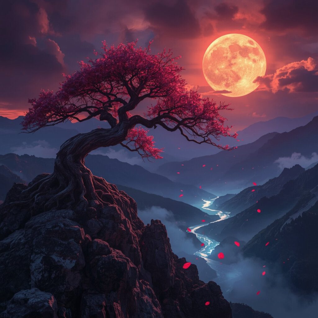 Dark wallpaper with the silhouette of a tree against a full moon.Download Image